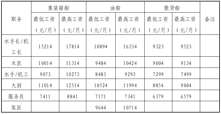 工資詳見下表(視船型及船舶大小而各有不同)。