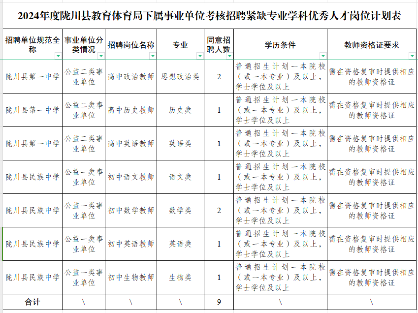 根據(jù)《關(guān)于同意縣教育體育局黨組使用編制通知單》(隴機編辦準[2023]4號)及《隴川縣人力資源和社會保障局關(guān)于印發(fā)2024年教育衛(wèi)生部門考核招聘緊缺專業(yè)學科優(yōu)秀人才工作方案的通知》隴人社發(fā)〔2024〕2號文件精神,2024年隴川縣教體系統(tǒng)考核招聘緊缺專業(yè)學科優(yōu)秀人才9名,其中:隴川縣第一中學4名、隴川縣民族中學5名。現(xiàn)將有關(guān)事宜公告如下: