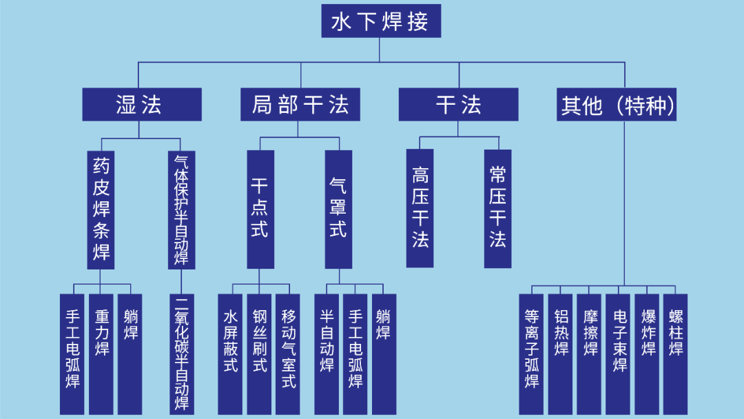 水下焊接如何分類,目前還沒有統(tǒng)一的規(guī)定。一般都從水下焊接所處的特殊環(huán)境,將水下焊接大體分為三類:濕法水下焊接、干法水下焊接和局部干法水下焊接。但隨著水下焊接技術的發(fā)展,又出現(xiàn)了一些新的水下焊接方法,如水下螺柱焊、水下爆炸焊、水下電子束焊和水下鋁熱焊等。這些焊法還難以確切地歸于哪一類,故暫按下圖分類。