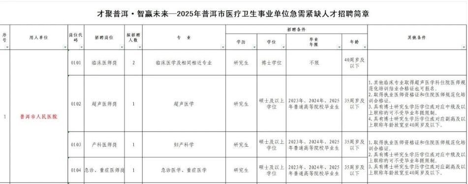 附件1+:2025年普洱市醫(yī)療衛(wèi)生事業(yè)單位緊缺急需人才招聘簡(jiǎn)章+