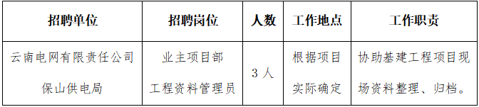 為支撐業(yè)務發(fā)展,解決臨時性、短期性人力資源緊缺問題,依據(jù)國家法律法規(guī)及公司規(guī)章制度規(guī)定,結合保山供電局實際情況,現(xiàn)面向社會公開招聘短期項目制用工3人,具體事項公告如下: