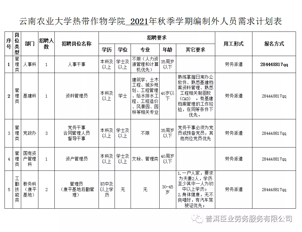 工作人員18名,均為云南農(nóng)業(yè)大學(xué)熱帶作物學(xué)院非事業(yè)編制人員(即編制外合同制人員),具體崗位信息詳見(jiàn)附件。